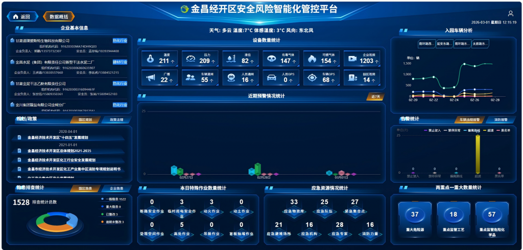 项目主要建设内容包括:构建基础应用平台与智慧运营中心大屏应用系统作为统一支撑与展示窗口;部署智慧安全监管系统与敏捷应急管理系统,强化日常监管与应急响应;通过园区封闭管理系统、管廊气体泄漏监测及易燃易爆有毒有害气体监测预警系统,实现对重点区域与环境风险的实时感知;配套建设移动应用系统(APP) 并强化公用工程安全风险感知能力,旨在形成覆盖全面、感知敏捷、反应快速的智能化安全管控体系。