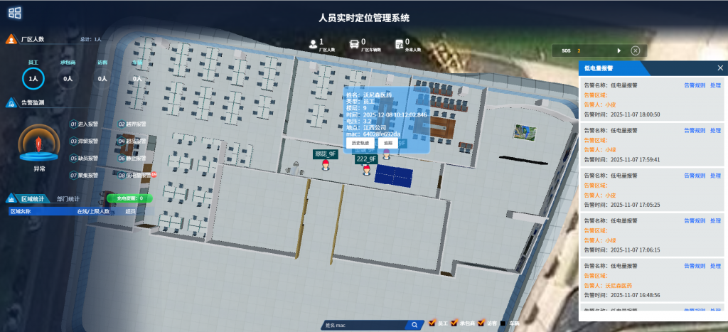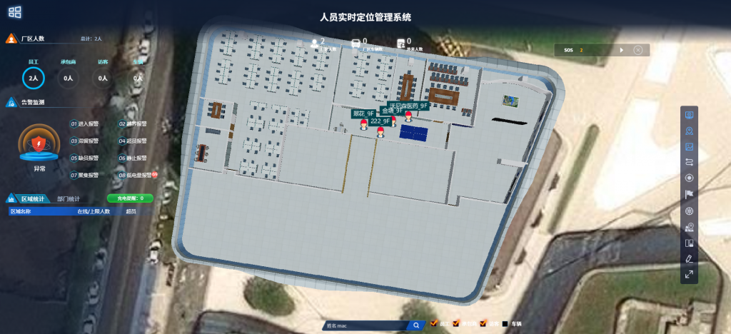 系统界面支持在平面地图、地图上直观显示现场人员位置,通过人员佩戴定位标签实时查看人员分布和在岗情况,且地图支持缩放、分层、单击建筑物等查看方式,点击地图中任一人员,显示人员详细信息。