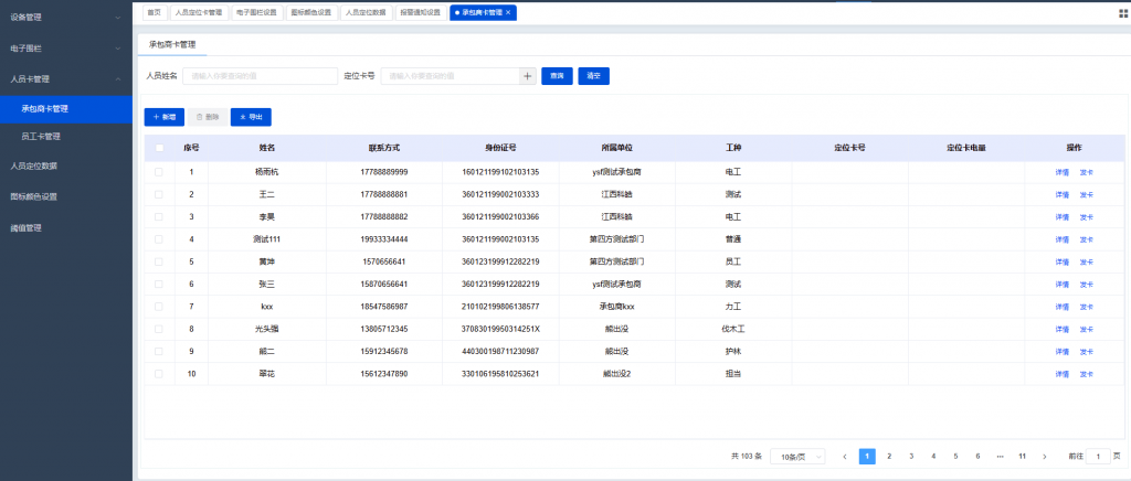 系统对企业门禁与人员身份识别卡片进行统一管理,涵盖门禁卡、定位卡、工牌的发放、挂失与注销等全过程。支持与门禁、定位等设备的集成联动,实现人员进出、区域管控与身份识别的高效管理。
