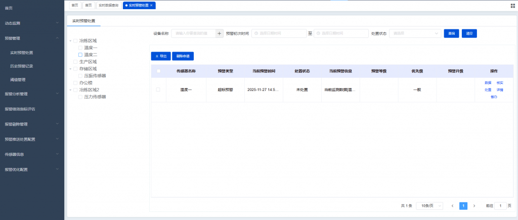 基于工业互联网,系统支持对接企业各类传感器,进行实时自动采集、在线监测、数据分析等。 支持对超标预警进行查看、核实、处理、转缺陷等操作,且具备完善的报警处理流程,实现报警从触发到闭环的全过程管理,确保每一次预警都有响应、有跟踪、有结论,提升预警处置效率与安全保障能力。