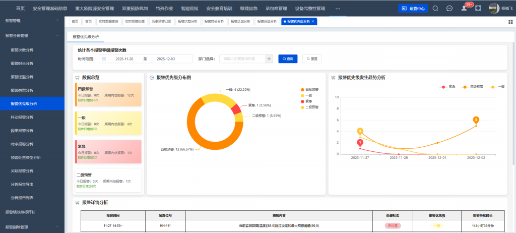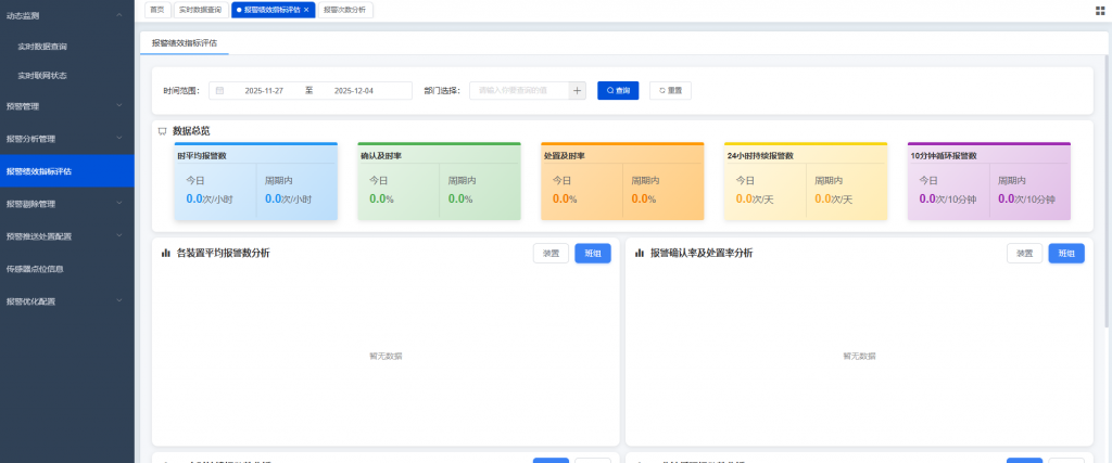 系统具备报警关键绩效指标(KPI)绩效指标评估功能,报警指标包括报警总数、报警状态、级别分布等,反映企业报警管理及处置水平情况。