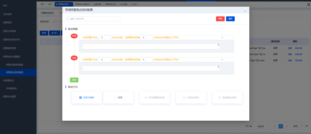 系统支持对报警处置及推送规则的自定义配置,报警未处置自动升级推送。根据企业实际情况配置报警升级内容及接收人,可现在应用内弹窗及短信两种推送方式。实现报警的及时处置。