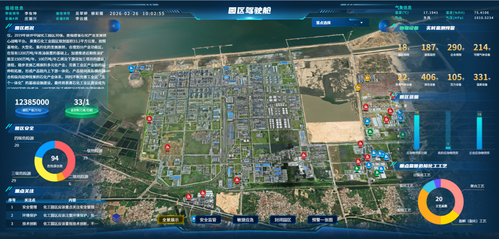 智慧化建设方面,园区通过构建涵盖安全基础管理、重大危险源监控、双重预防机制、气体泄露监测及敏捷应急等功能的综合管控平台,并配套建设园区驾驶舱、企业端系统及完善的数据治理体系,实现了管理集约化与服务智能化,显著提升了数据资源整合效率与信息化服务水平。